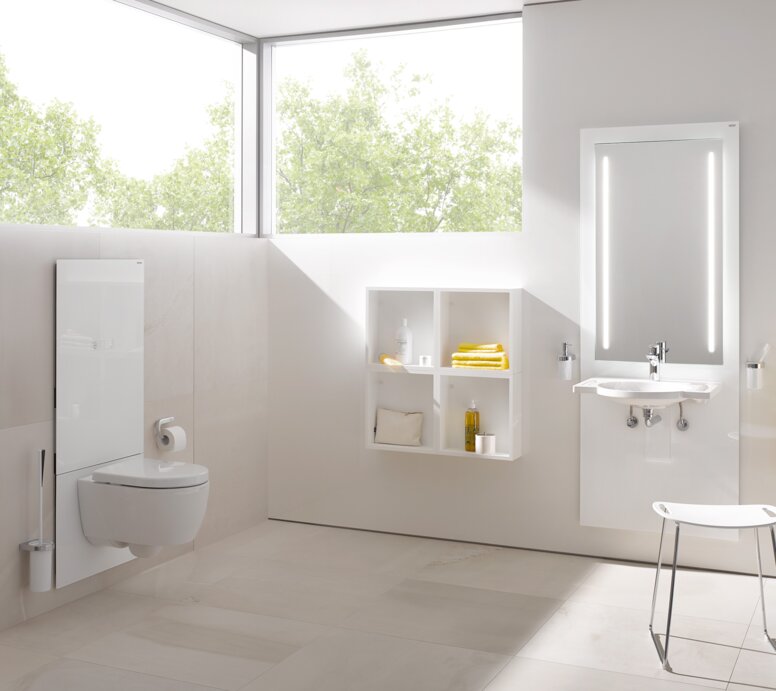 Für NutzerInnen mit eingeschränktem Sehvermögen spielen Blendfreiheit und Kontraste eine zentrale Rolle. Indirektes Licht, satinierte Leuchtenabdeckungen oder LED-Spiegel mit diffuser Ausleuchtung verhindern harte Schatten und Reflexionen. HEWI bietet hierfür beleuchteten Spiegel, die das Gesicht gleichmäßig ausleuchten und gleichzeitig den Raum erhellen.