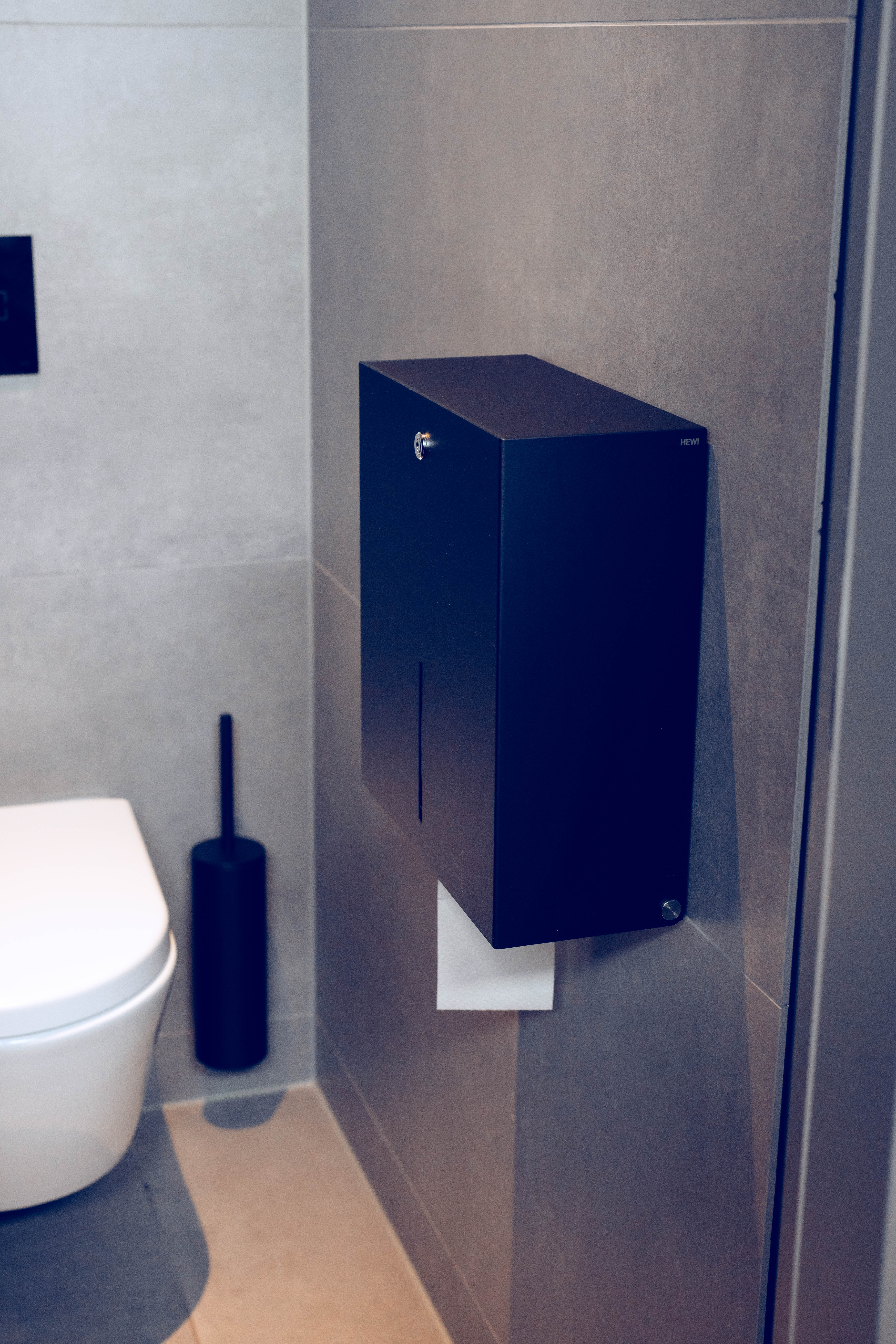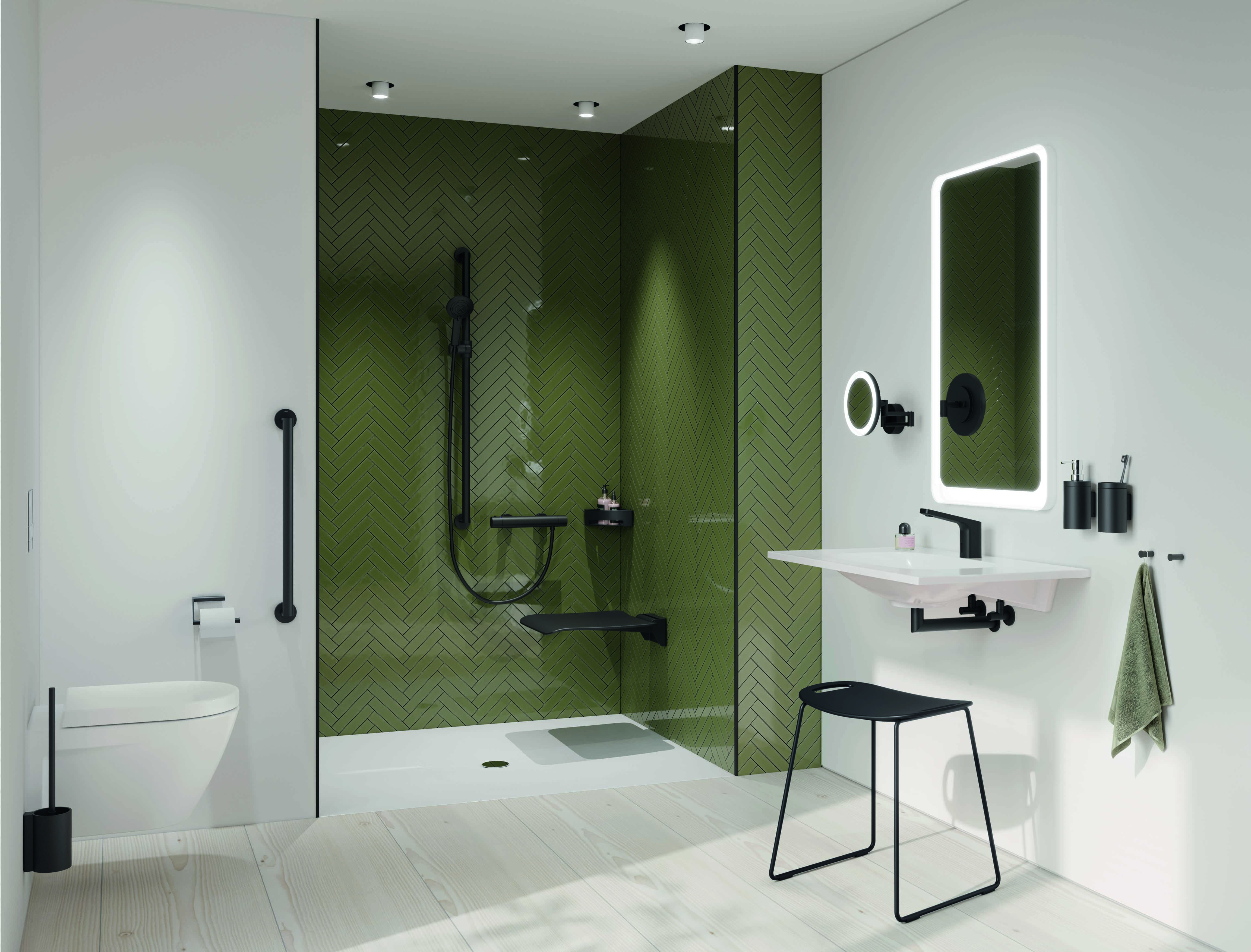 Mit einem umfänglichen Portfolio an Sanitär- und Beschlaglösungen in Schwarz matt bietet HEWI eine durchgehende Gestaltung – von der Tür bis ins Bad.