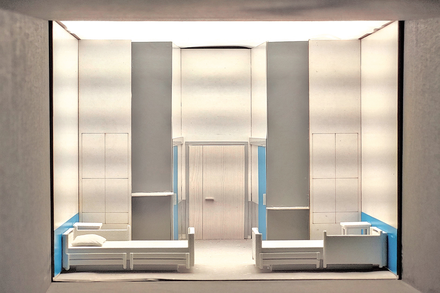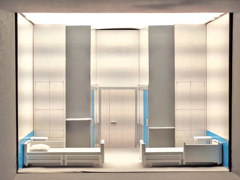 Auch wenn das Patientenzimmer schon immer im Zentrum des Krankenhausbaus und der Hygiene gestanden hat, ist seine Bedeutung in den vergangenen Jahren in den Vordergrund gerückt – durch die Zunahme von Krankenhausinfektionen mit multiresistenten Erregern und nicht zuletzt durch SARS-CoV-2. Hier soll jetzt unter anderem eine kluge Raumplanung helfen, die Übertragung gefährlicher Keime zu verhindern. Deshalb sieht das neue Forschungslabor auch nur auf den ersten Blick aus wie ein ganz normales Zweibettzimmer im Krankenhaus: Denn im Patientenzimmer der Zukunft stehen die Betten gegenüber statt nebeneinander und es gibt zwei Bäder. Diese Aufteilung verhindert Kreuzkontaminationen und Kontaktinfektionen, wie sie passieren können, wenn zwei Personen dieselbe Nasszelle nutzen. Entlang der Arbeitsrouten des Pflegepersonals haben die Forschenden außerdem sechs Desinfektionsmittelspender platziert. Auch an eine besondere Lichtgestaltung haben die WissenschaftlerInnen gedacht – von ganz hell bei der Visite, über warme Farben in Ruhezeiten bis hin zu einer Lichtleiste, die sensorgesteuert aktiviert wird, wenn die PatientInnen nachts aufstehen.