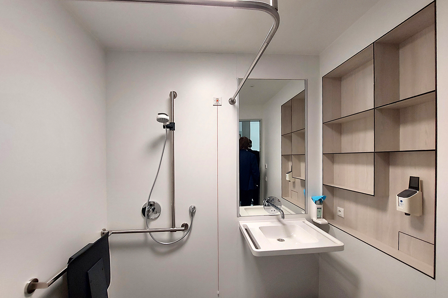 Eigene Bäder für alle PatientInnen, fugenlose und leicht zu reinigende Nachttische mit schmutzabweisenden Oberflächen, automatisierte Reinigungskonzepte, Desinfektionsmittelspender, die bei Benutzung einen Smiley zeigen: So könnte das „Patientenzimmer der Zukunft“ aussehen. Der begehbare Demonstrator eines solchen Zweibettzimmers wurde am 31. August 2022 auf dem Gelände des Städtischen Klinikums Braunschweig eröffnet. In dem Forschungs- und Studienlabor entwickeln Expert*innen aus den Bereichen Architektur, Materialforschung und Medizin praxistaugliche Musterlösungen für die Krankenhaus-Architektur. Dafür haben sich die Technische Universität Braunschweig, das Fraunhofer-Institut für Schicht- und Oberflächentechnik IST und das Städtische Klinikum Braunschweig zusammengeschlossen. Im Projekt eingebunden sind auch 19 IndustriepartnerInnen, darunter HEWI.
