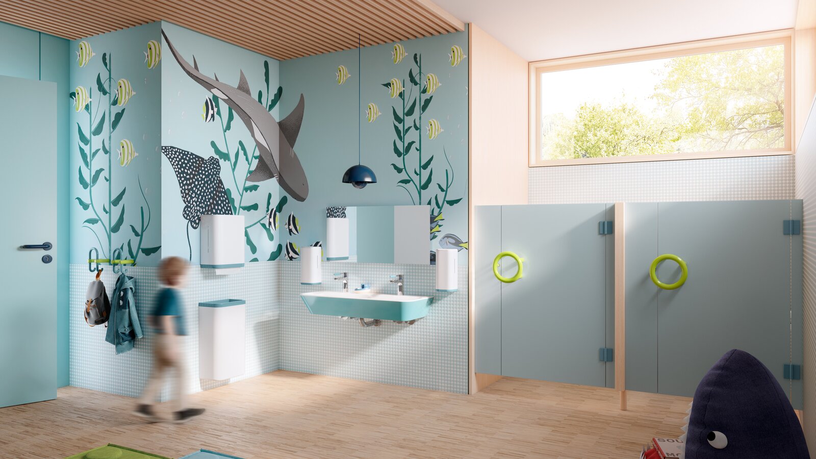 HEWI ICONIC stands for durable design that harmoniously combines form, function and quality. The range impresses in children’s areas with clear lines and a reduced, yet kid-friendly style. Be it in the sanitary area, in the cloakroom or for accessibility elements – ICONIC can be used in a variety of ways and offers great design freedom. The importance of visual orientation is particularly evident in the context of World Children’s Day 2025: With friendly colour combinations such as aqua blue, steel blue and may green as well as apple green, may green and coral, ICONIC not only creates an appealing environment, but also supports children’s spatial understanding and emotional perception.