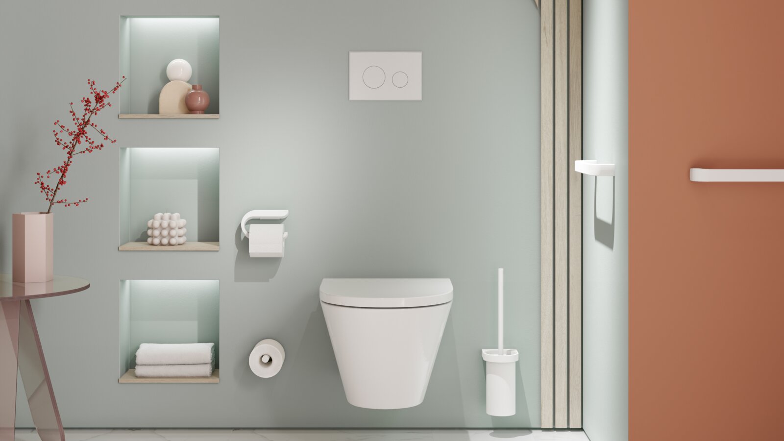 One example of a high-quality design solution is the System 162 from HEWI. This impresses with a straightforward design language and a clearly defined choice of materials. The precise mitre cut, which creates an elegant look, is particularly characteristic. The system is available in a high-quality chrome-plated version, in matt polished stainless steel, with PVD surfaces or powder-coated. Inserts made of satinised glass or high-quality polyamide are also available to round off the design;