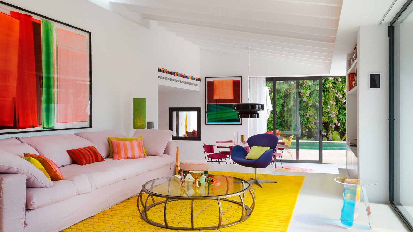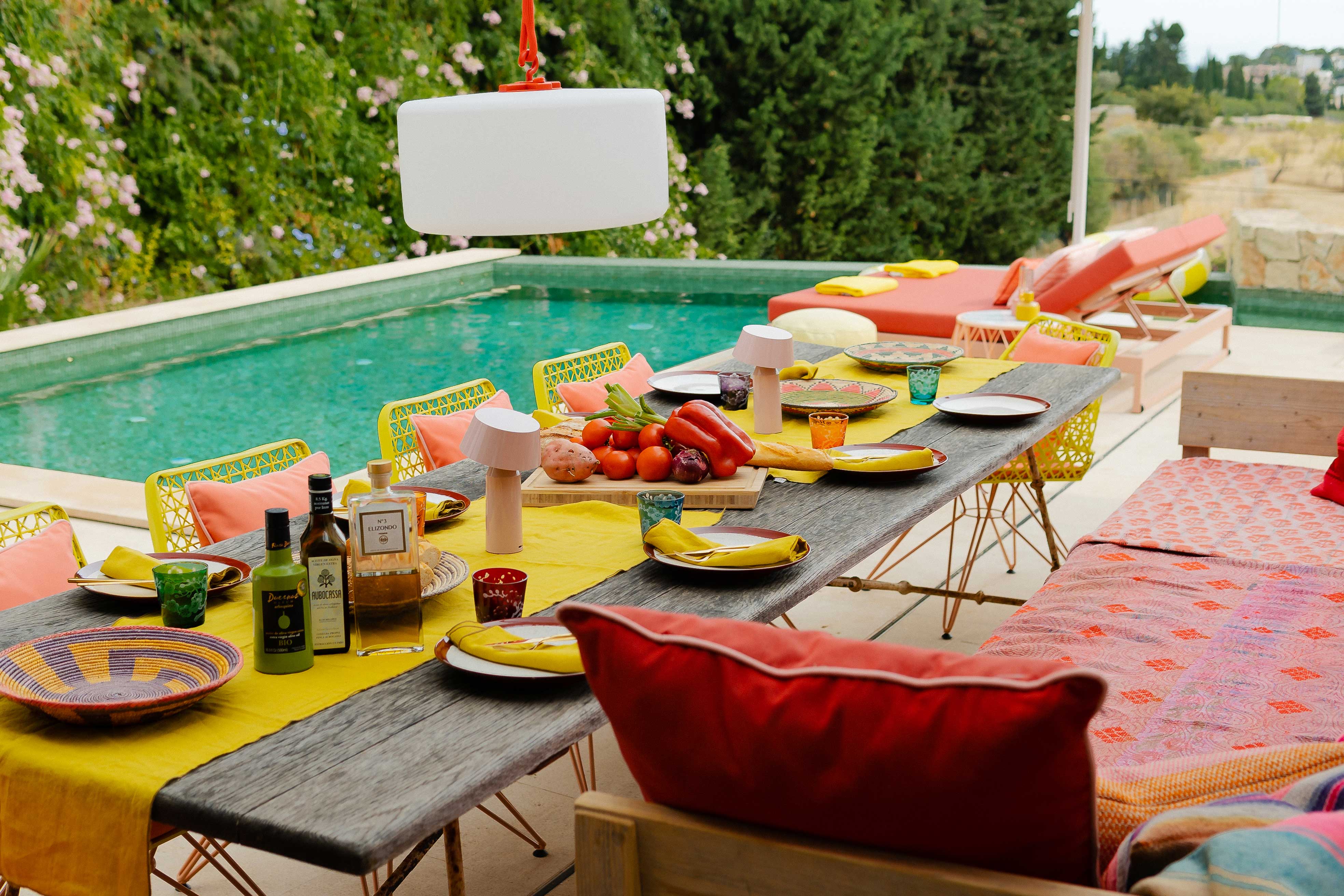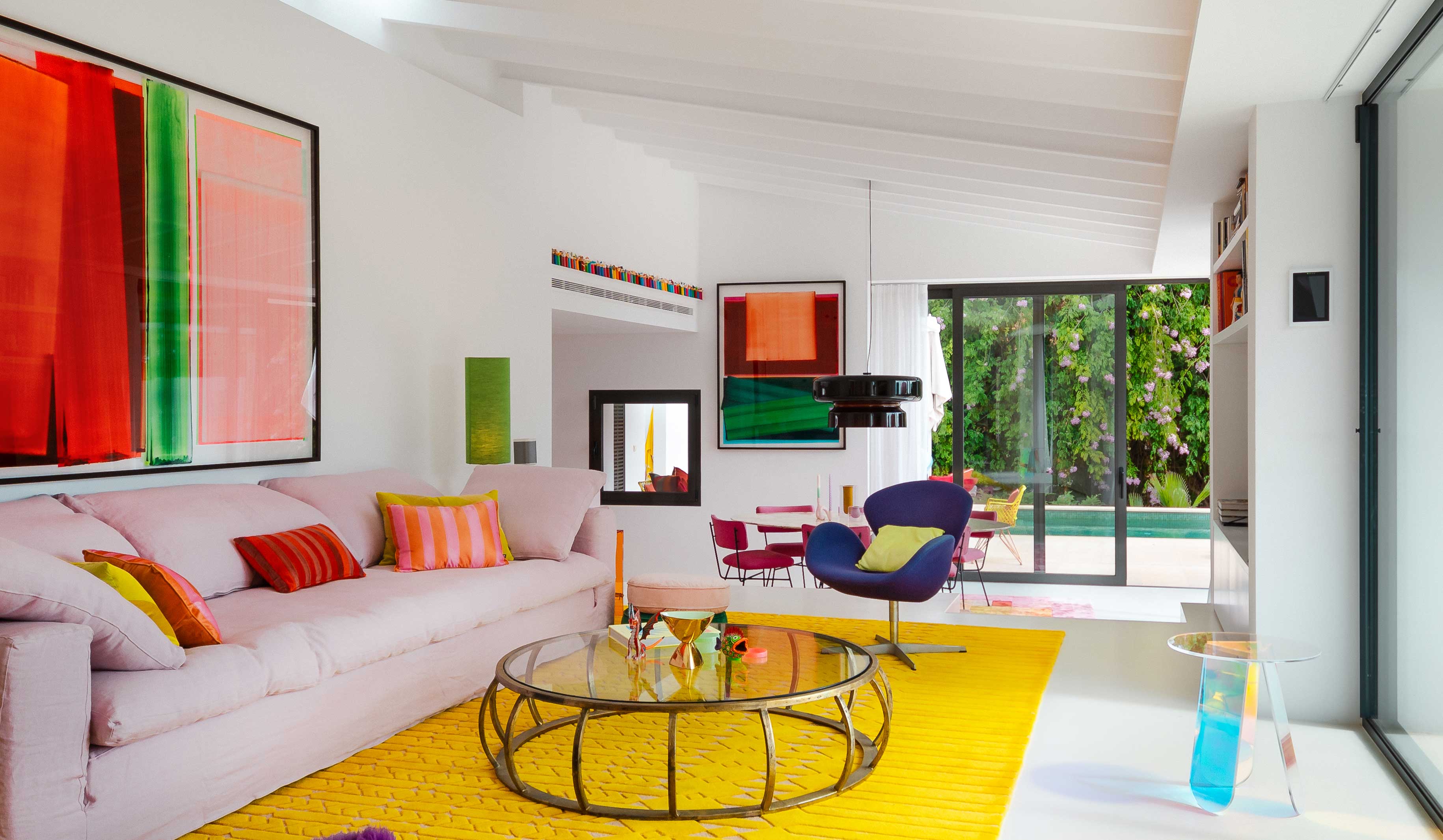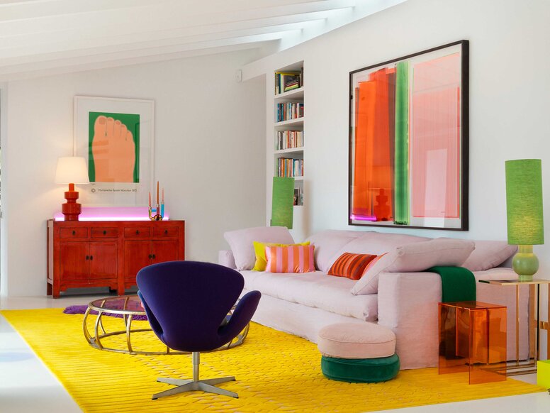 Leja’s designs focus on light, openness and, of course, colour – as the high-quality interior design of the house shows. Bright yellow, rich pink, red, and orange, and various shades of green – inspired by the surrounding Mallorcan nature – shape the character and stand for an carefree attitude towards life. A special feature is the combination of complementary colours such as purple on a yellow carpet or pink and red. These harmonise with each other in the highest luminosity.