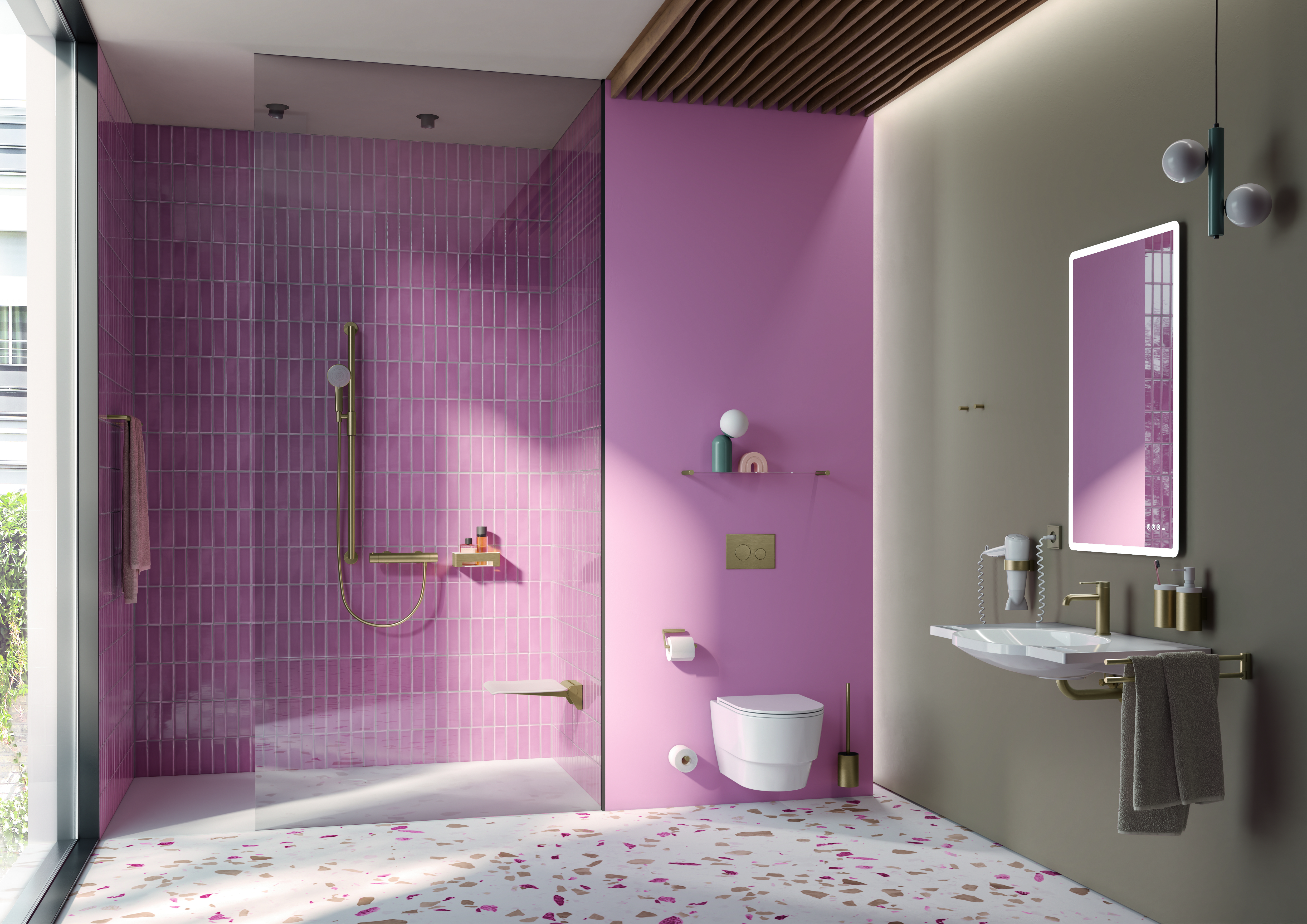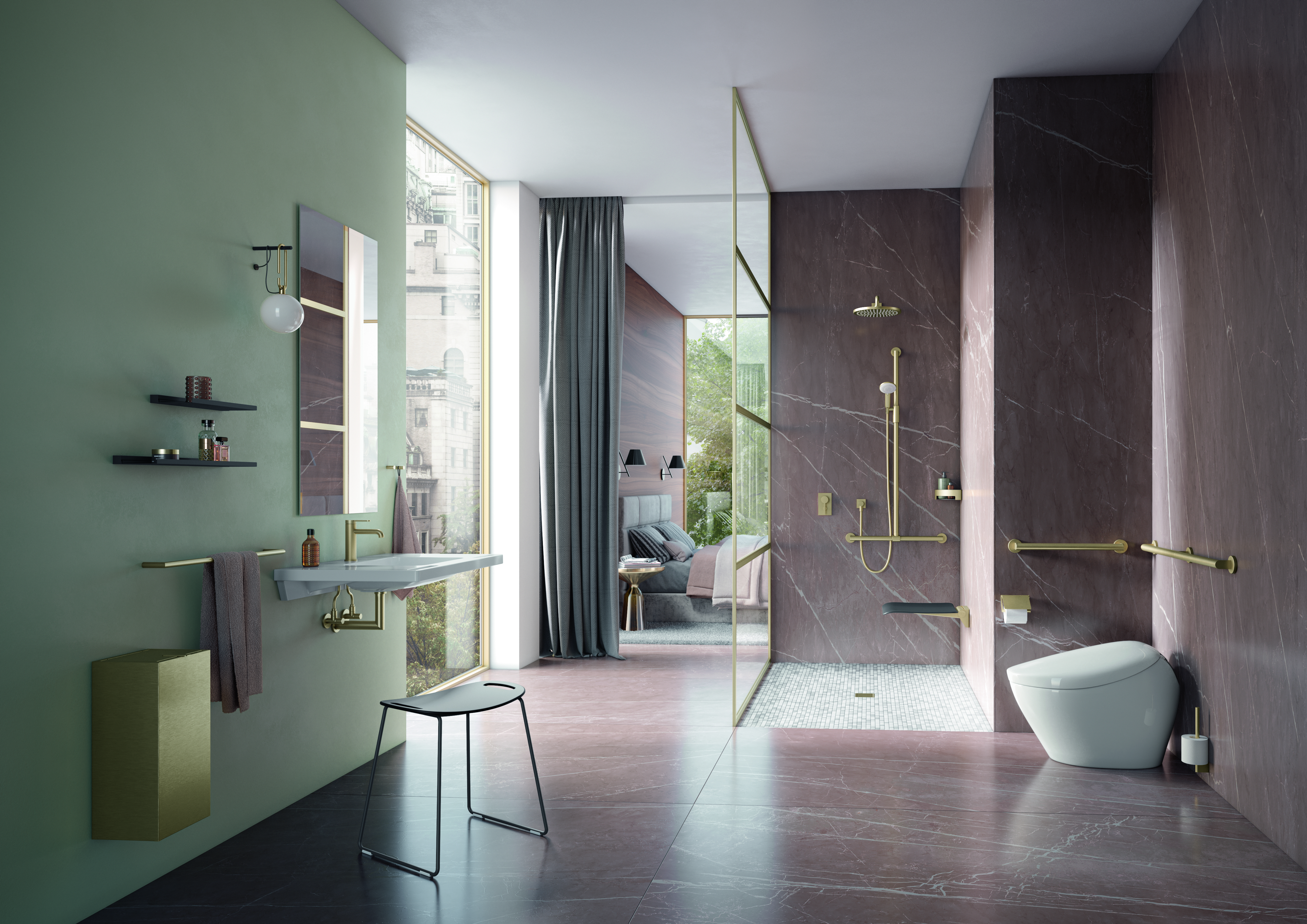 More glamour in the bathroom: Brass, bronze or gold are just some of the new metallic designer surfaces from HEWI that can be used to transform contemporary sanitary rooms into personalised oases of well-being – be it in hotels, in representative public buildings, in elective surgery areas in hospitals or in the bathroom at home. Altogether, the manufacturer is offering five colours in either brushed or glossy finishes for its accessible sanitaryware and accessories, all manufactured in the PVD process. This allows for even more diversity and scope for bathroom planning.