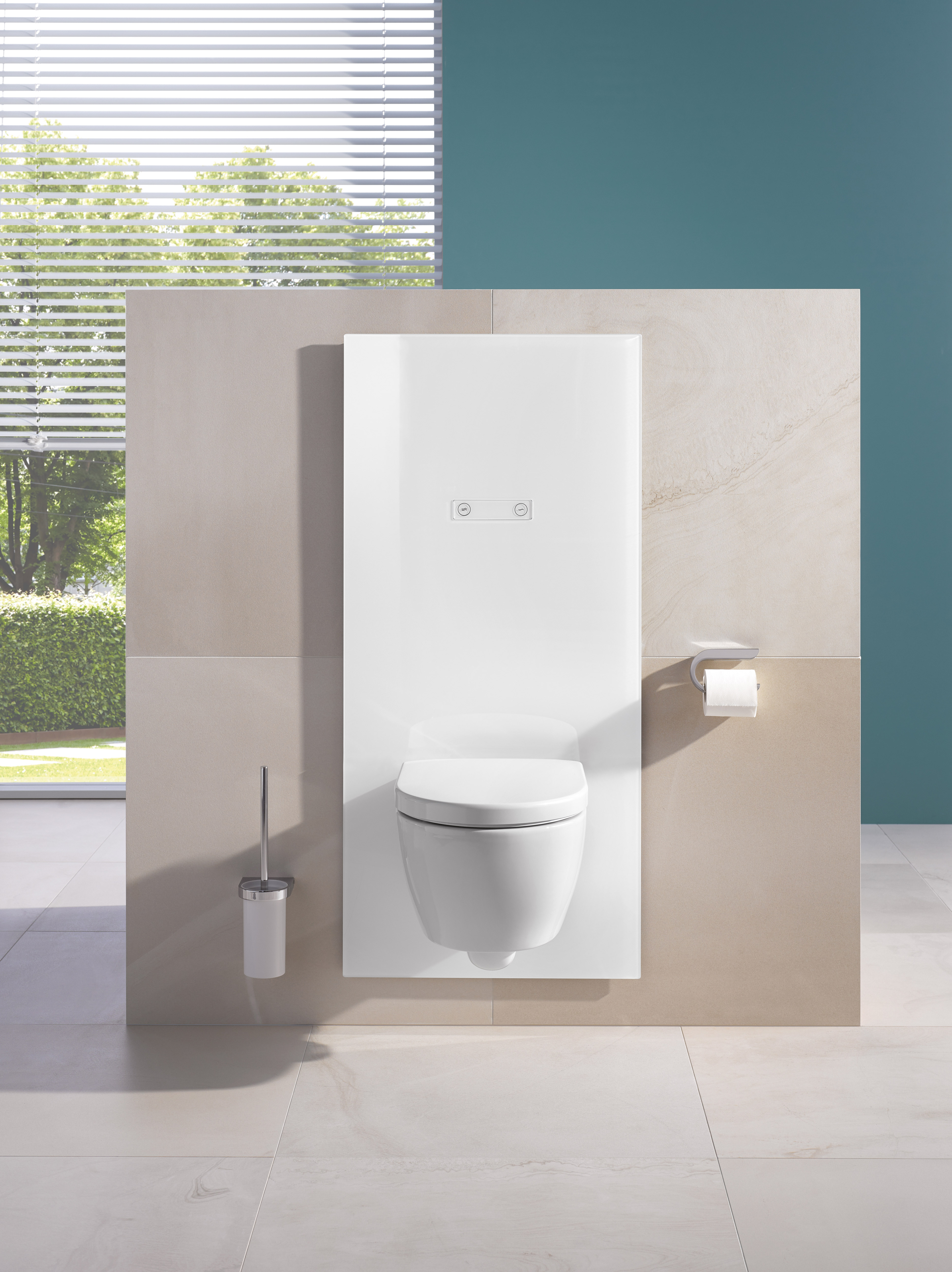 With the height-adjustable WC module the user is able to adjust the height of the WC individually. The seat height of the WC module can be varied by up to 150 mm upwards to a height of 575 mm and downwards to 425 mm. The WC module can even be adjusted during use and so simultaneously acts as a convenient sitting down and standing up aid. Optional hinged support rails can be integrated next to the WC, which provide additional support and safety for the user. The hinged support rails are mounted at an accessible height next to the WC and are adjusted vertically to match the WC. Flushing is activated via a sensor-controlled flushing mechanism or a manual flushing plate. The WC module has standard connections and can be combined with selected bidet toilets.