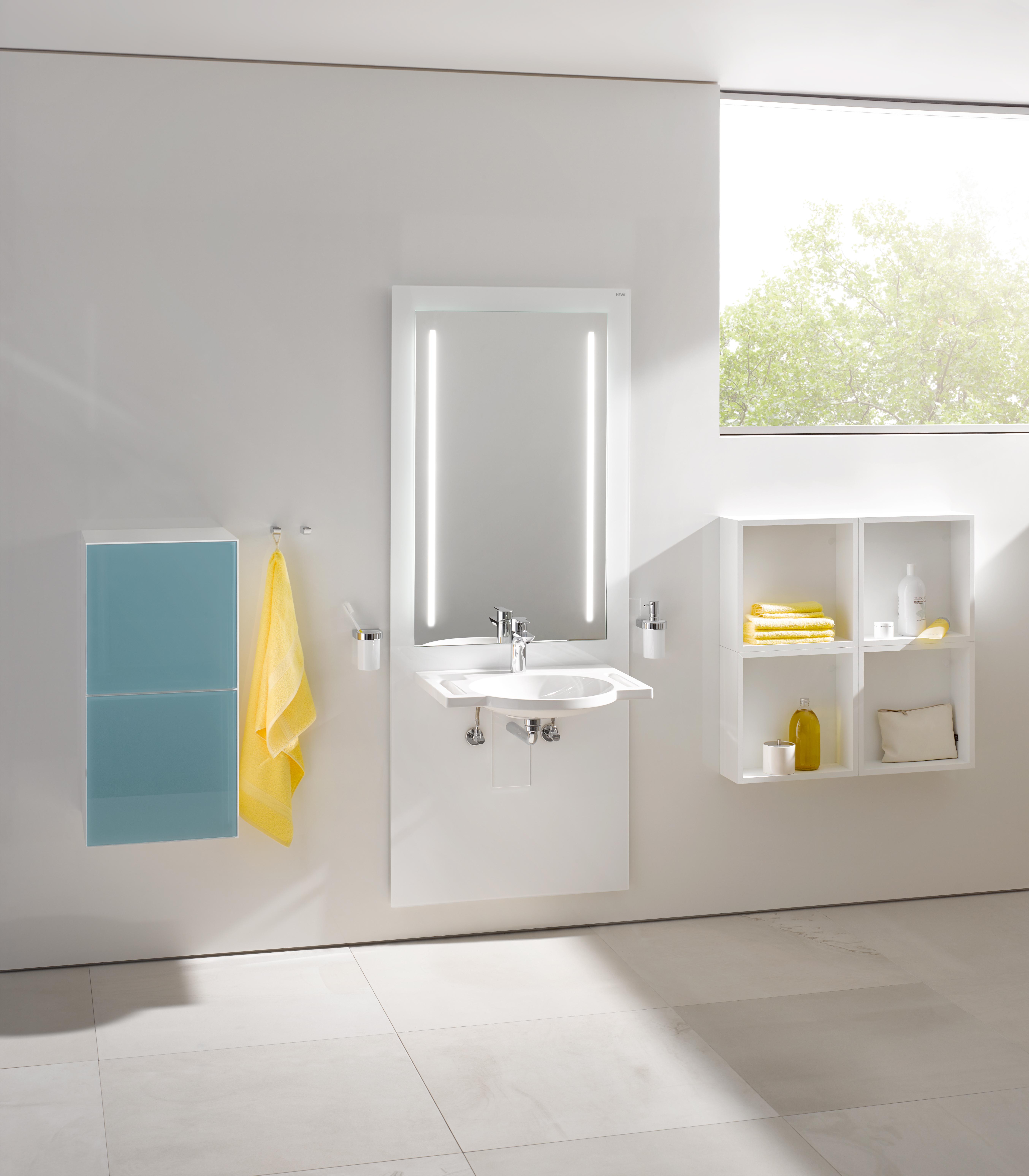 The height-adjustable washbasin module can be continuously adjusted from 700 mm to 1000 mm to the height required by the user. With an integrated mirror, which extends to the top of the washbasin, the module can be used both in a standing and in a seated position. The washbasin module is also available with integrated illuminated mirror. The warm white LED lighting behind satin-finished mirror edges ensures a harmonious light source. The module can be combined with the HEWI washbasin made of mineral composite. Integrated gripping/handle slots can be used as support rails or practical towel rails. S 50 is based on two components: a prewall installation, which is installed during the building shell phase and a prefabricated kit, which is made up of the respective functional elements and the finishing acrylic glass fronts. Both S 50 modules fulfil the height requirements of DIN 18040, SIA 500 and ÖNORM B 1600.