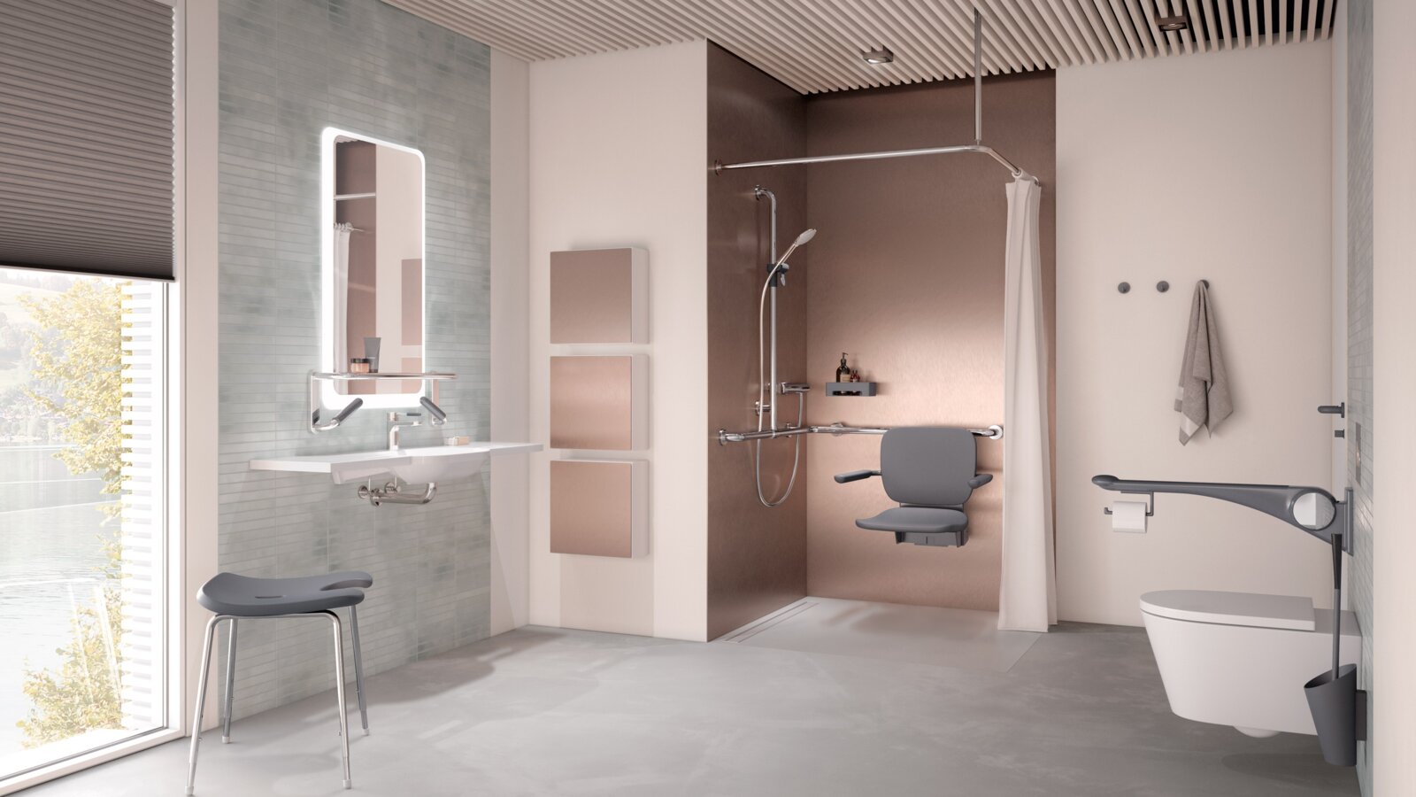 The professional care system from HEWI has a new look. The flexible, adaptable and expandable system impresses with a modern style in the new design. The chrome accents have been retained as a design element and stand as a recognition value for the system. The style puts people in the foreground and promotes the independence of the users. Additional functions that can be put together individually, such as the height-adjustable plate for the seats and hinged support rails, also guarantee comfortable use of the products for everyone.