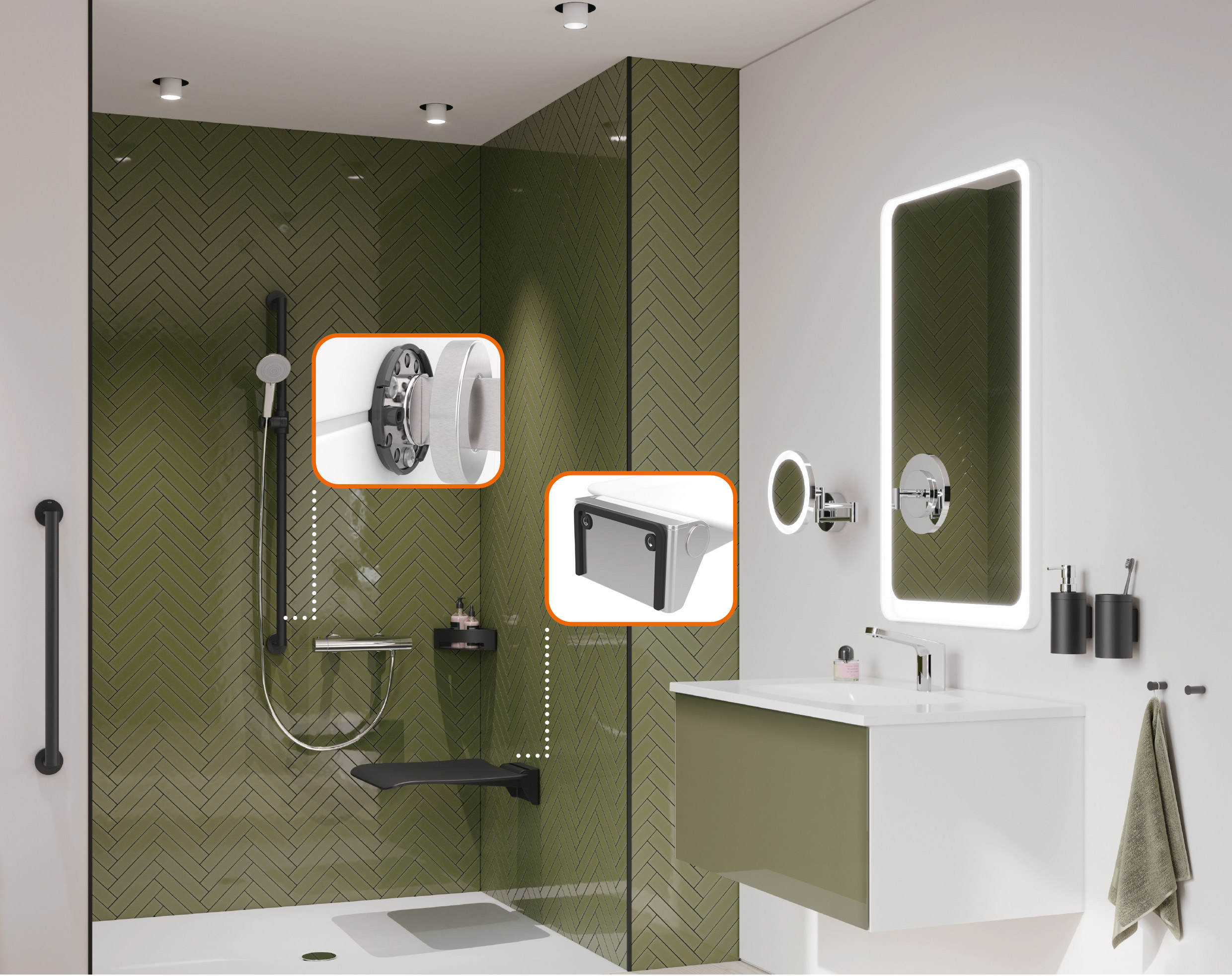 HEWI sealing strips adapt to the respective surface when mounting retaining systems and shower seats as well as folding support handles and seal them so that neither water nor moisture can penetrate. In the case of shower seats, in addition to the sealing tape components, the mini sealing discs for sealing the drilling points provide additional protection.